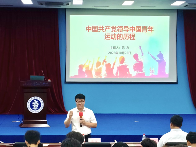 随后,学院党委副书记陈友以“中国共产党领导中国青年运动的历程”为主题开展入党启蒙教育。讲座围绕“躺平不可取,躺赢不可能”的时代命题,回溯了五四运动开启中国青年运动新纪元的光辉历史,系统梳理了新民主主义革命时期、社会主义革命和建设时期、改革开放和社会主义现代化建设新时期党领导青年运动的奋斗脉络,教导学子以青春之力书写责任与担当。
