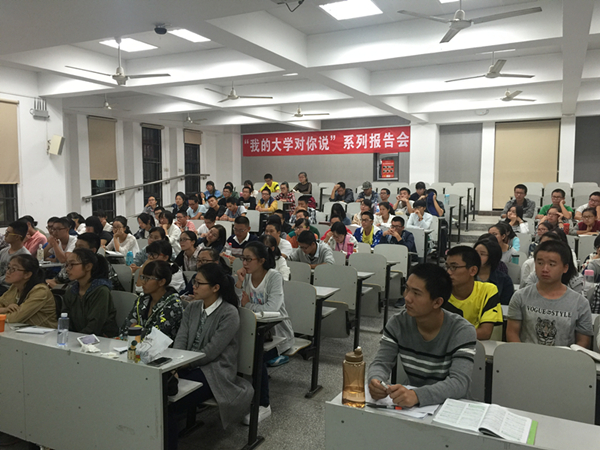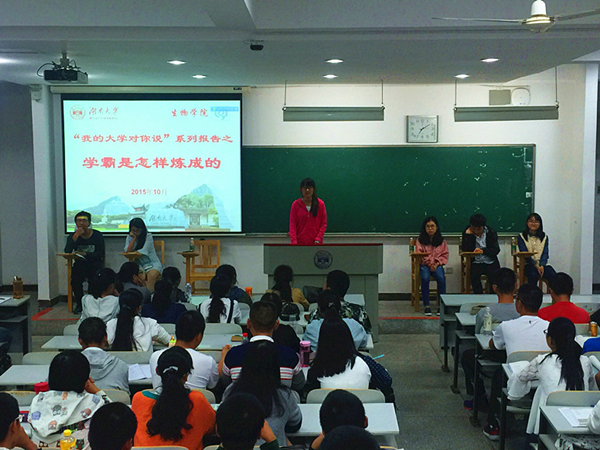 10月11日,必赢3003no1线路检测中心2015级新生入学教育活动系列活动之“我的大学对你说--学长的火炬”第一场报告会在综合楼成功举行,本次报告会以“学霸是怎样炼成的”为主题,邀请2012、2013、2014三个年级的六位优秀学长苏晓雅、蔡琳俐、李雪纯、余凯、王紫欣、李志雄和新生分享大学生活中的经验和教训、收获与感悟。报告会由年级长于欣瞳主持。