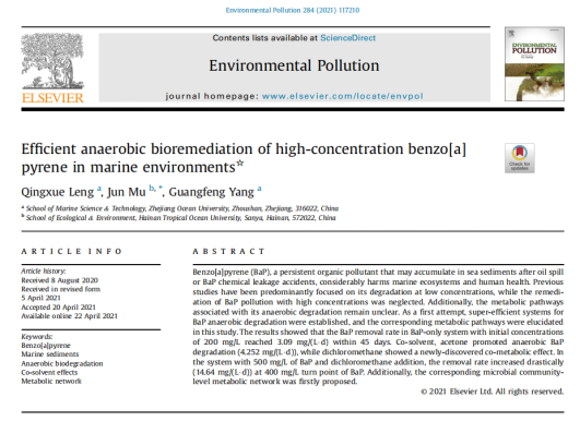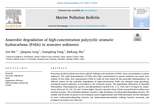 近来,beat365在线唯一官网教授穆军团队在海洋溢油沉积物中多环芳烃的生物修复方面取得一系列重要进展,以我校为唯一通讯单位,先后在《Environmental Pollution》上发表《海洋环境中高浓度苯并芘的高效厌氧生物修复》;在《Marine Pollution Bulletin》上发表《海水沉积物中高浓度多环芳烃的厌氧降解》成果。
