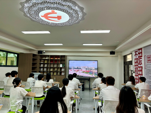 直播过程中,师生们全神贯注地观看大会的每一个环节,认真聆听习近平总书记的重要讲话。当阅兵仪式开始时,看到受阅部队步伐铿锵,从新型部队方阵到信息化现代化队伍,师生们心潮澎湃,深受震撼。