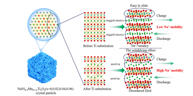 NaNi0.5Mn0.5O2(NNMO)因具备良好的电化学活性已成为钠离子电池的关键正极材料。然而,NaNi0.5Mn0.5O2的相变不可逆和动力学迟缓问题极大地限制了其在钠离子电池中的应用。本文采用固相法制备了不同量的Ti掺杂O3-NaNi0.5Mn0.5-xTixO2正极材料。Ti掺杂策略有效地稳定了过渡金属层,扩大了Na层间距,抑制了Na+/空位的有序化。特别是得到的O3-NaNi0.5Mn0.46Ti0.04O2 (NNMOTi-4)在0.1C下的初始可逆容量为108.6 mAh g−1,在1C下循环100次后的容量保持率高达65.2%。因此,本工作提供了一种简便的Ti掺杂策略来调节钠离子电池层状NaxTMO2的结构和电化学性能。研究得到国家自然科学基金、海南省自然科学基金等项目联合资助。